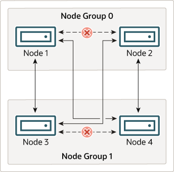 这对于 NDB Cluster 的持续运行意味着:只要参与集群的每个节点组至少有一个节点在运行,集群就拥有所有数据的完整副本,并且可以继续运行。下图说明了这一点。