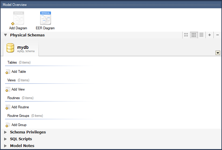 首次打开 MySQL Workbench 时,默认模式 mydb 会显示在 MySQL Workbench 的 物理模式 部分最左侧的选项卡中,如下图所示。您可以使用此默认模式开始设计数据库。