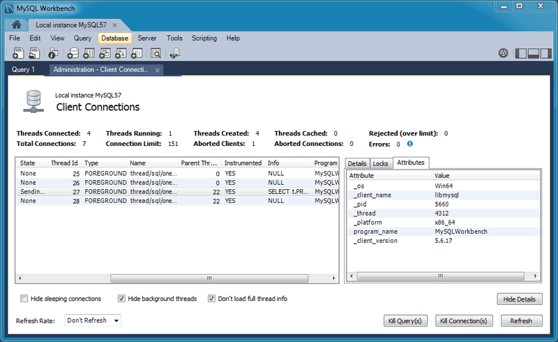 客户端连接浏览器列出了活动和休眠的 MySQL 客户端连接,并添加了终止语句和连接以及查看其他连接详细信息和属性的功能。下图显示了本地主机上的客户端连接信息的示例。