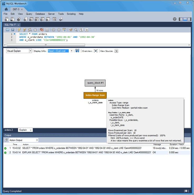 新 o_clerk 索引被考虑和使用,查询扫描了 1546 行而不是 32642 行,查询执行时间从 0.281 秒提高到 0.234 秒。但是,EXPLAIN 估计此查询扫描 1546 行以返回 18 行。再次查看查询后,请考虑多列索引可以满足基于 o_orderdate 和 o_clerk 列的 WHERE 子句的条件,如下一个语句所示。